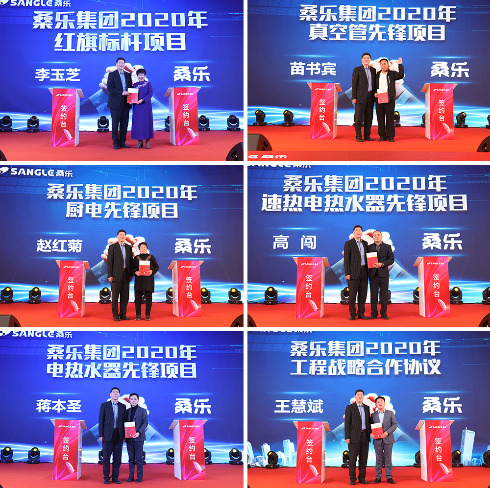 今年春雷,光芒項目的簽約也非常振奮人心,光芒代表著榮耀,也代表著先鋒和領(lǐng)航,簽約者更是各領(lǐng)域佼佼者,在新品推廣、營銷活動、工程項目等方面皆起到先鋒范作用。在現(xiàn)場所有經(jīng)銷商家人的共用見證下,董事長先后與李玉芝簽訂“桑樂集團2020年紅旗標桿項目”、與苗書賓簽訂“桑樂集團2020年真空管先鋒項目”、與趙紅菊簽訂“桑樂集團2020年廚電先鋒項目”、與高闖簽訂“桑樂集團2020年速熱電熱水器先鋒項目”、與蔣本圣簽訂“桑樂集團2020年電熱水器先鋒項目”、與王慧斌簽訂“桑樂集團2020年工程戰(zhàn)略合作協(xié)議”,在新的五年征程,向規(guī)模要銷量,向戰(zhàn)略要效益。