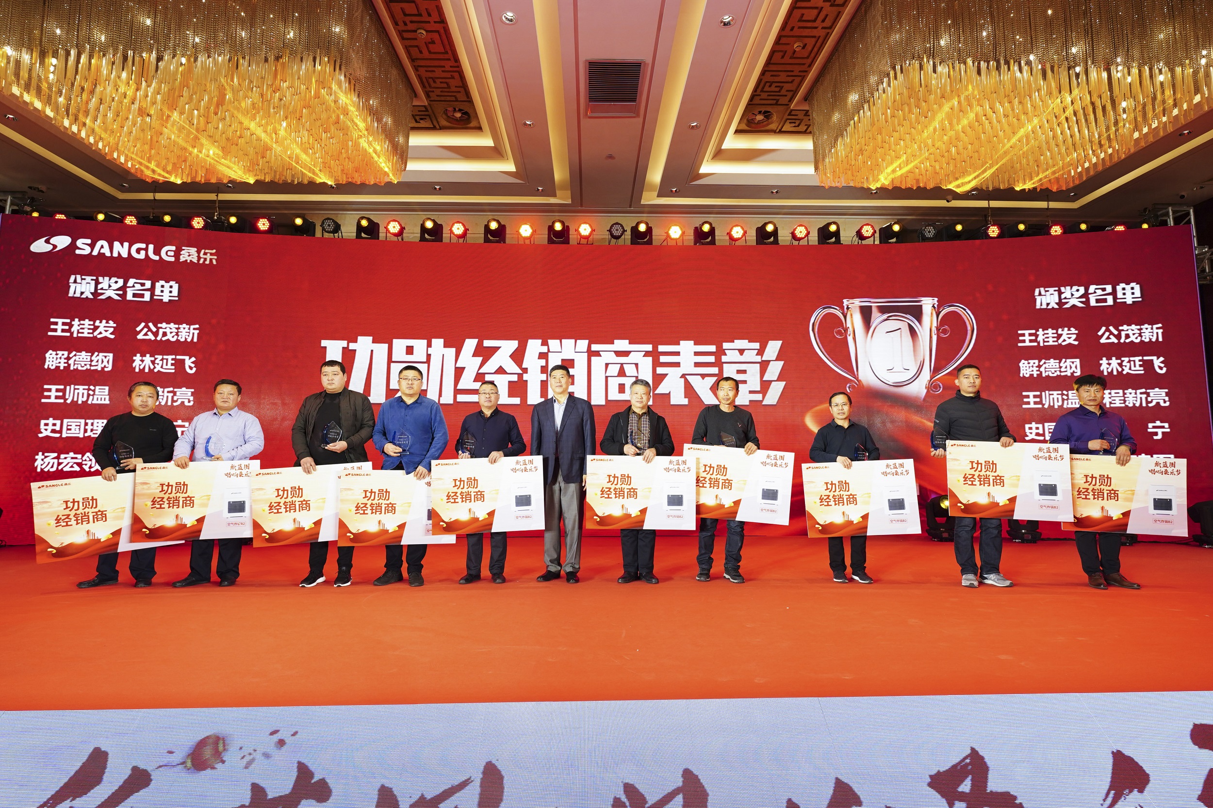 為感謝經(jīng)銷商今年對桑樂做出的突出貢獻(xiàn),現(xiàn)場進(jìn)行了隆重的表彰儀式。首先,董事長為完成2020年簽約達(dá)成的經(jīng)銷商依次頒發(fā)鉆石、金牌、銀牌、優(yōu)秀的簽約表彰獎(jiǎng)。隨后,董事長頒發(fā)了新銳經(jīng)銷商獎(jiǎng),5G銷售標(biāo)兵獎(jiǎng),卓越工程經(jīng)銷商獎(jiǎng)以及桑樂真空管、電熱水器、速熱熱水器、廚電銷售冠軍獎(jiǎng)。除此之外,董事長為加盟超過20年且業(yè)績貢獻(xiàn)突出的經(jīng)銷商代表頒發(fā)了功勛經(jīng)銷商獎(jiǎng)?,F(xiàn)場掌聲雷動,累計(jì)頒發(fā)了7項(xiàng)大獎(jiǎng),表彰近200人次,一個(gè)個(gè)獎(jiǎng)項(xiàng)背后是無數(shù)人同心協(xié)力,同甘共苦的成果,凝聚著桑樂人的智慧汗水。